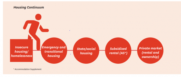The illustration above shows a simplified progression along the housing continuum. Not all people on the Social Housing Register move through each stage of the continuum. Some go straight into state/social housing and some with housing need access to the private market with Accommodation Supplements.